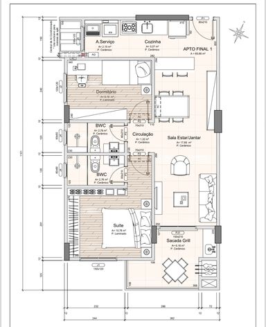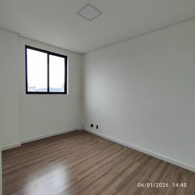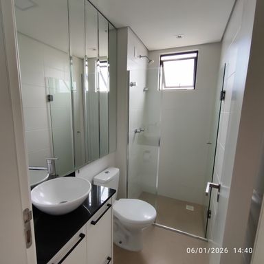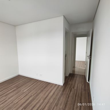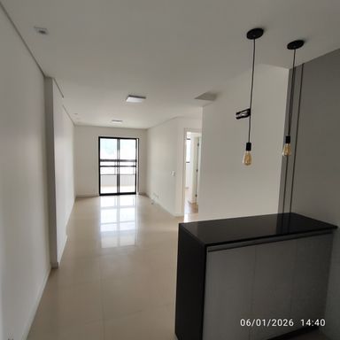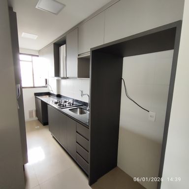 Apartamento de 2 quartos, sendo 1 Suíte + 1 dormitório e 1 vaga privativa de garagem, com armário na cozinha e banheiros.